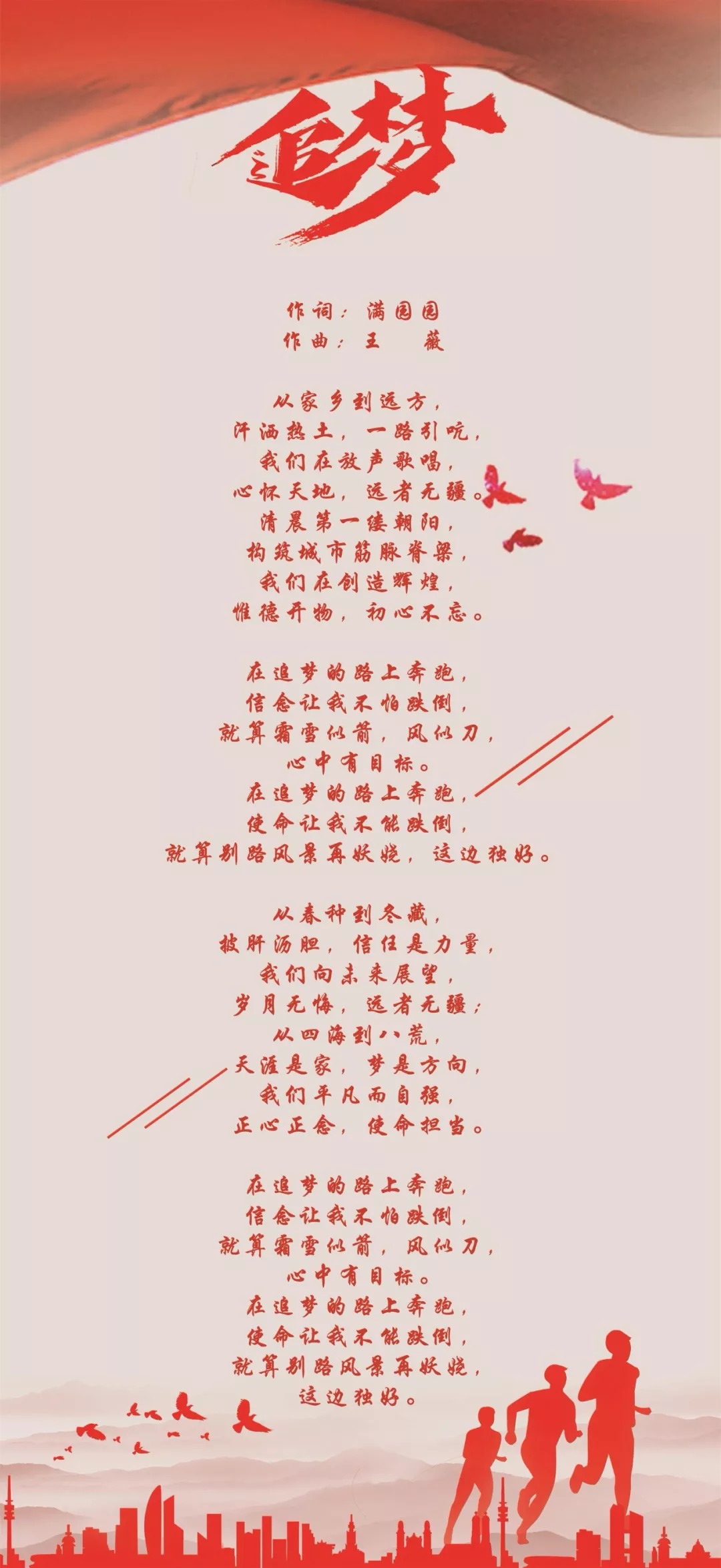 《追梦》是龙安集团党委原创歌曲,唱出了龙安人积极回应习总书记“我们都在努力奔跑、我们都是追梦人”的呼吁,体现出集团干部职工立足新时代,敢于追梦、不懈奋斗的家国情怀;歌曲中包含着建投集团“抱一至永、远者无疆”的企业文化理念,满载着龙安党员干部不忘初心、勇担使命,为实现国企担当奋力作为的实干精神。唱响龙安旋律,向中华人民共和国成立70周年献礼!